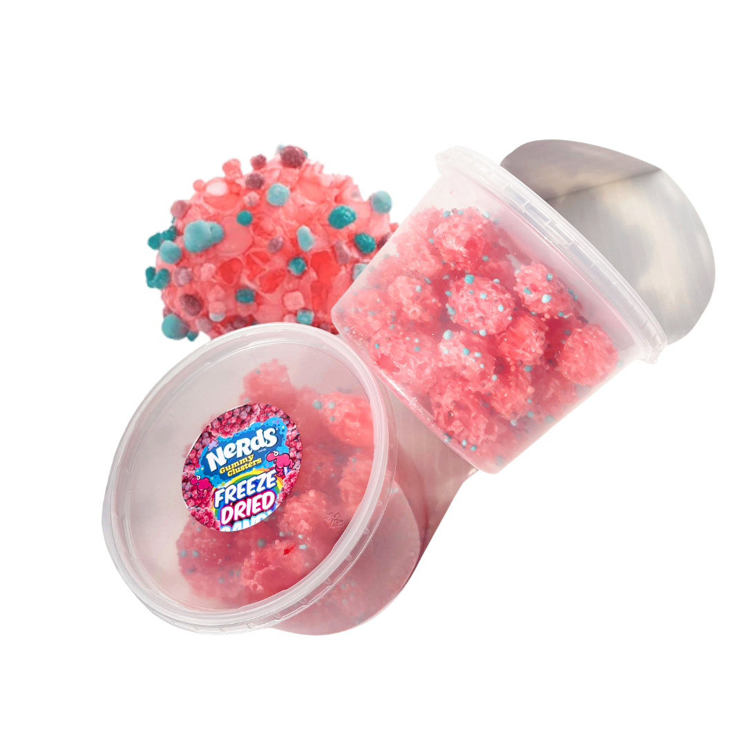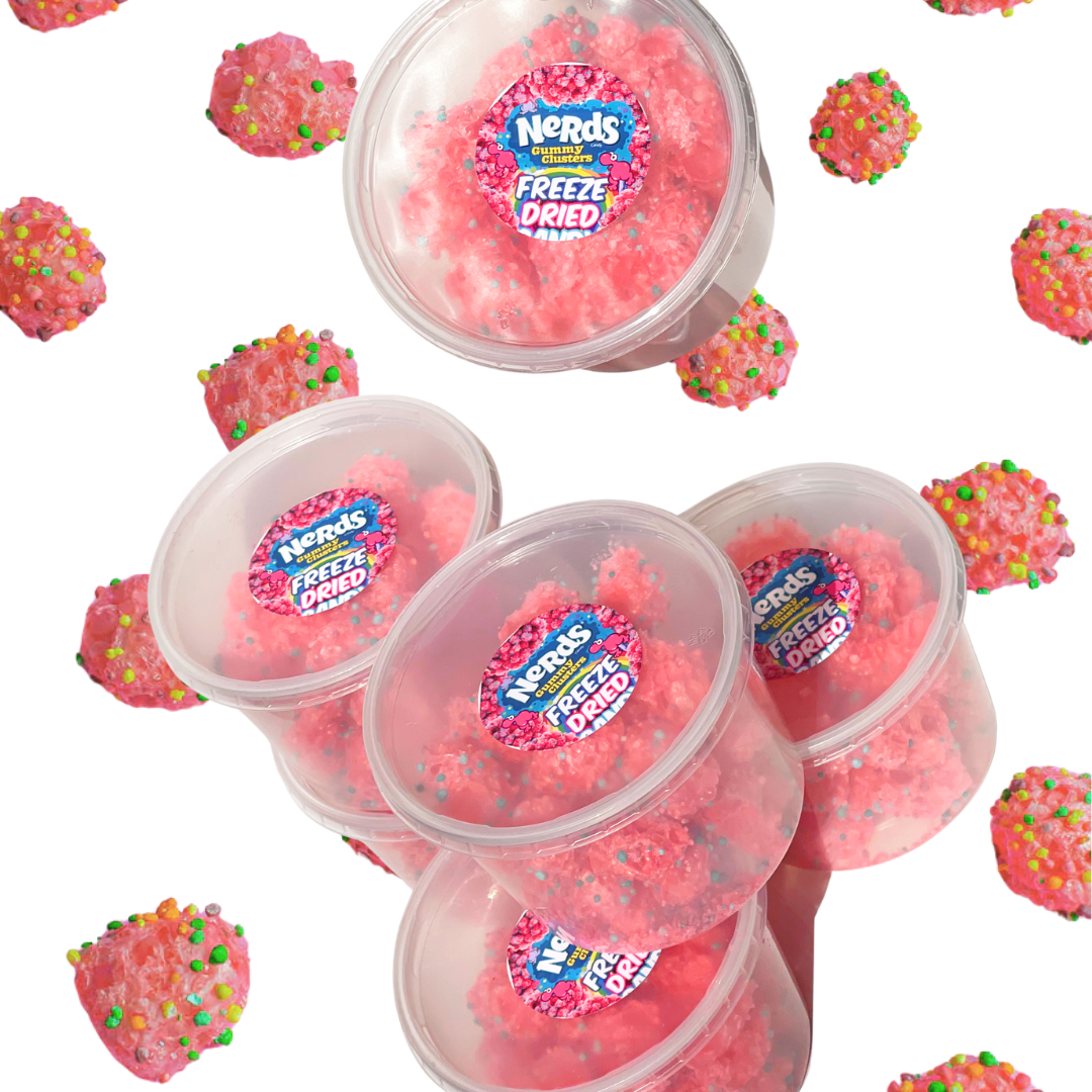 Our Freeze Dried Nerds Gummy Clusters are an irresistible snack that packs an intense flavour punch! It's a unique puffy nerd-covered clouds of goodness with a texture that is indulgently satisfying. The freeze drying process removes moisture and creates air bubbles which cause the nerd clusters to puff up and become crunchy ⋆˙⟡ Experience a snack unlike any other!